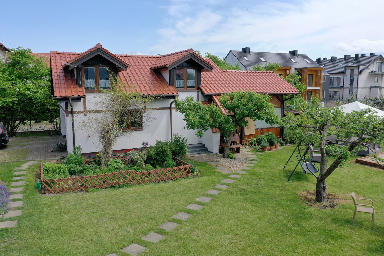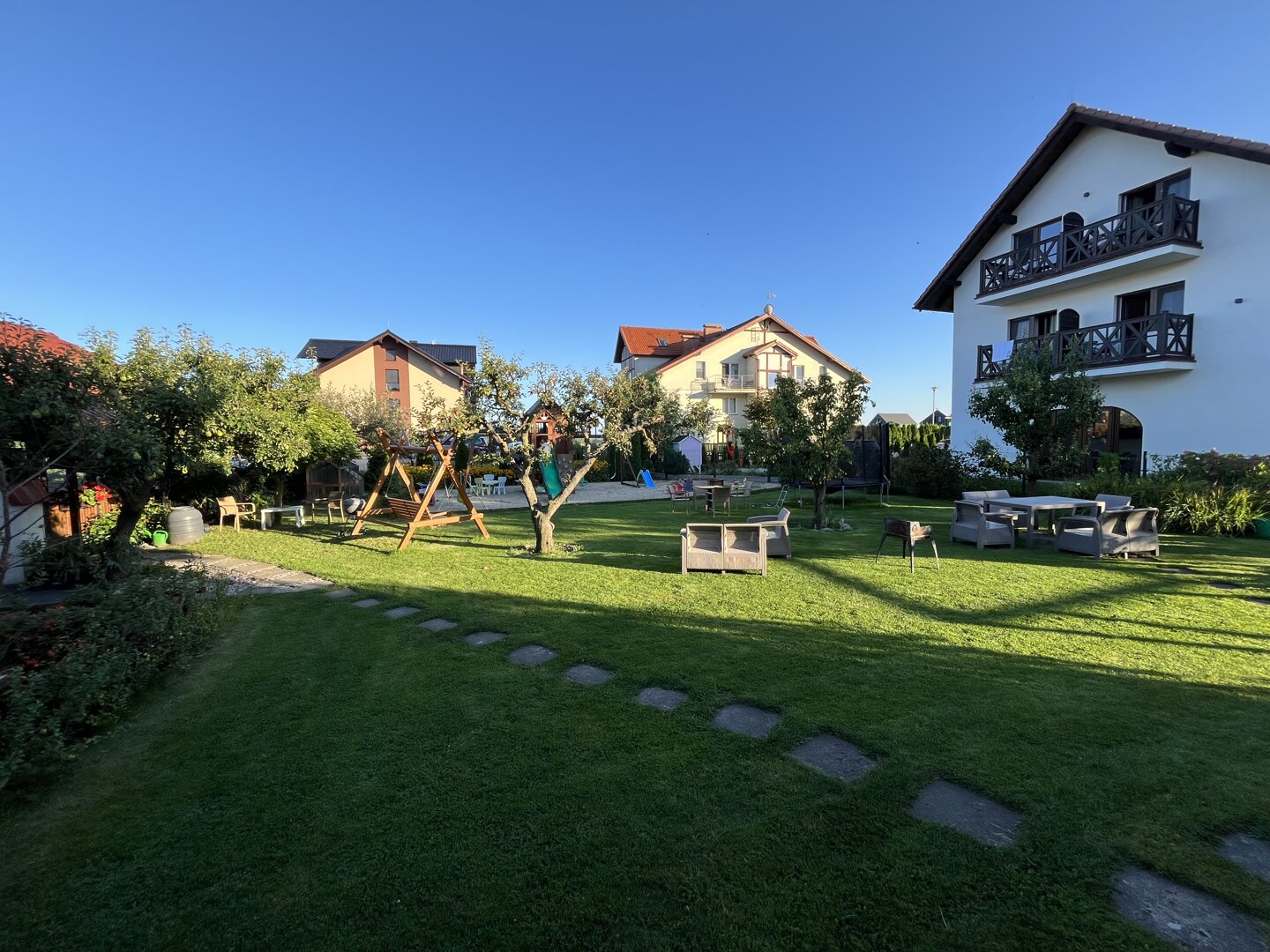 Dbamy także o bezpieczną przestrzeń, w której dzieci mogą się bawić, odkrywać świat i cieszyć swobodą a rodzice zaznać odrobiny relaksu. W naszym dużym ogrodzie wypełnionym kwiatami, drzewami owocowymi i poziomkami znajduje się domek królików, przestronny i wysypany piaskiem, atestowany plac zabaw z urządzeniami dla dzieci w różnym wieku . Nie mamy pokoju zabaw, jednakże w holu znajduje się multimedialny ekran z edukacyjnymi grami dla dzieci w wieku 2-12 lat, który z pewnością umili czas gdy na dworze mokro.