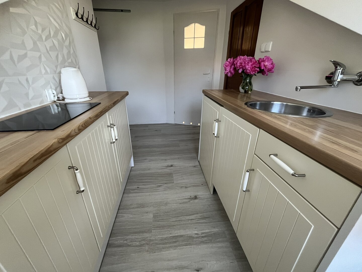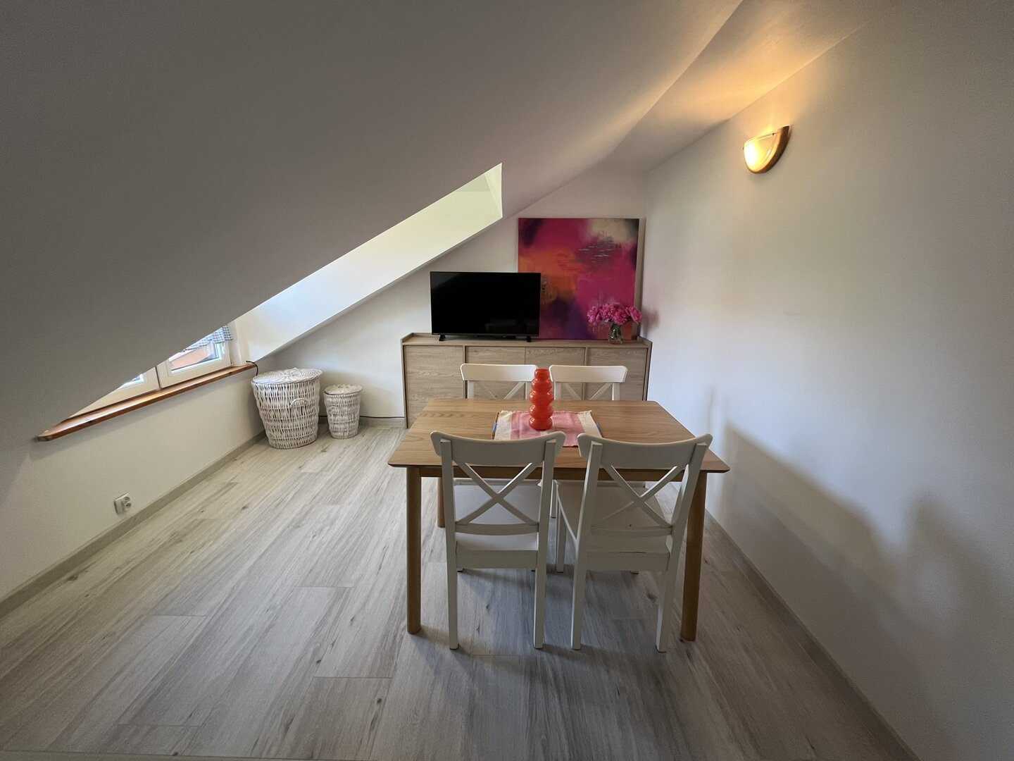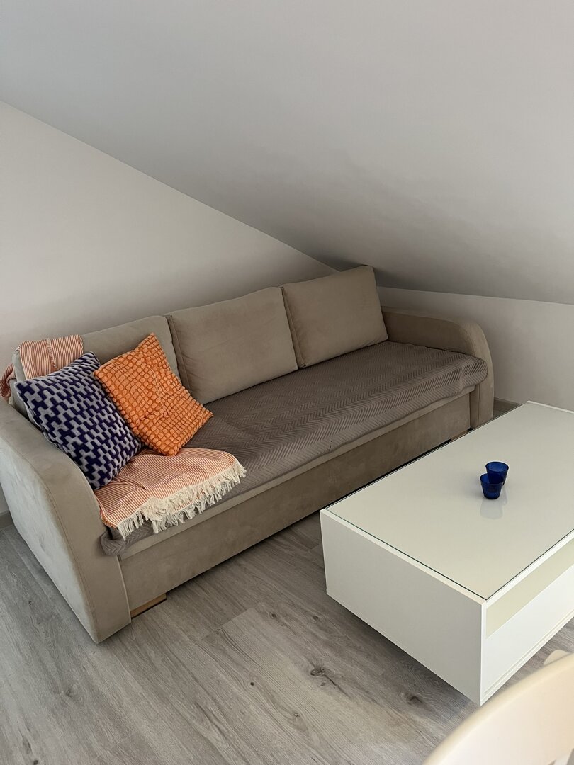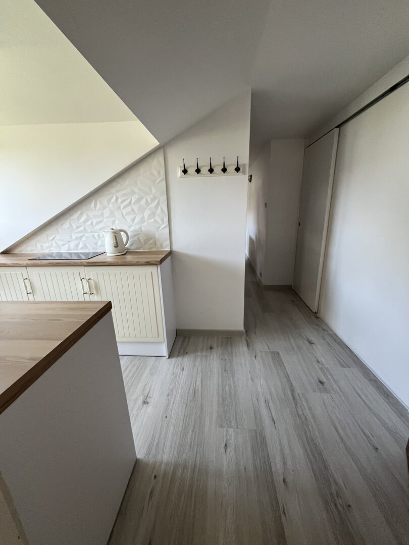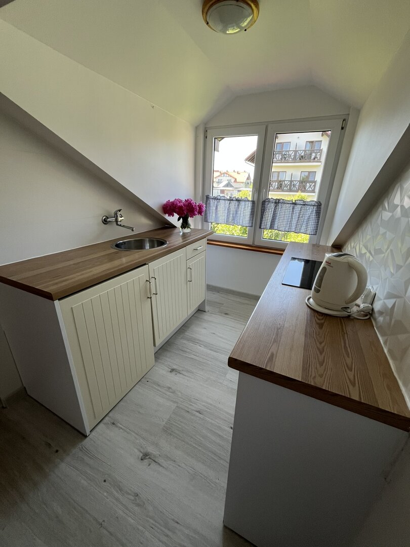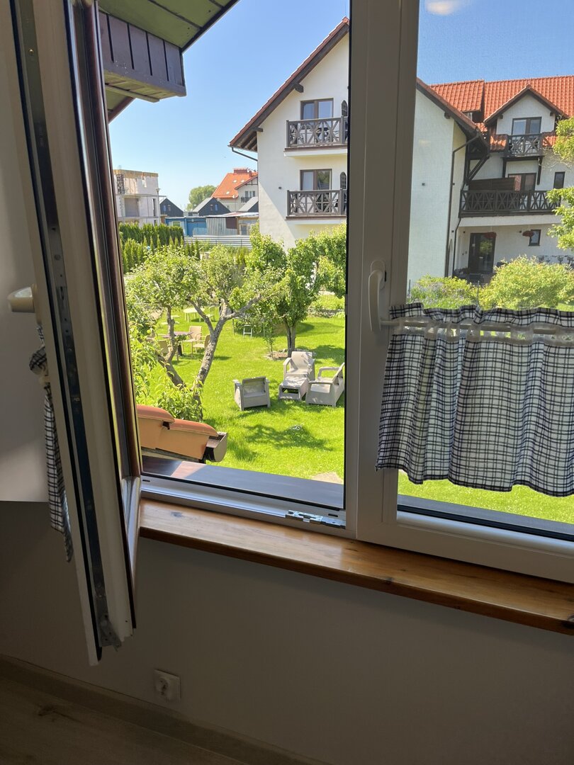 Zaletą apartamentu jest widok na ogród i na zieleń leszczyn. Pomieszczenia w apartamencie są w niektórych miejscach niskie, dlatego zachęcamy do zapoznania się z galerią zdjęć.